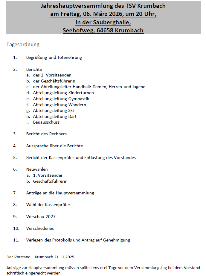Der TSV Krumbach 1911 e.V. lädt zu seiner Jahreshauptversammlungam Freitag, den 06. März 2026, um 20 Uhr, in die Sauberghalle, Seehofweg, in 64658 Krumbach, ein.